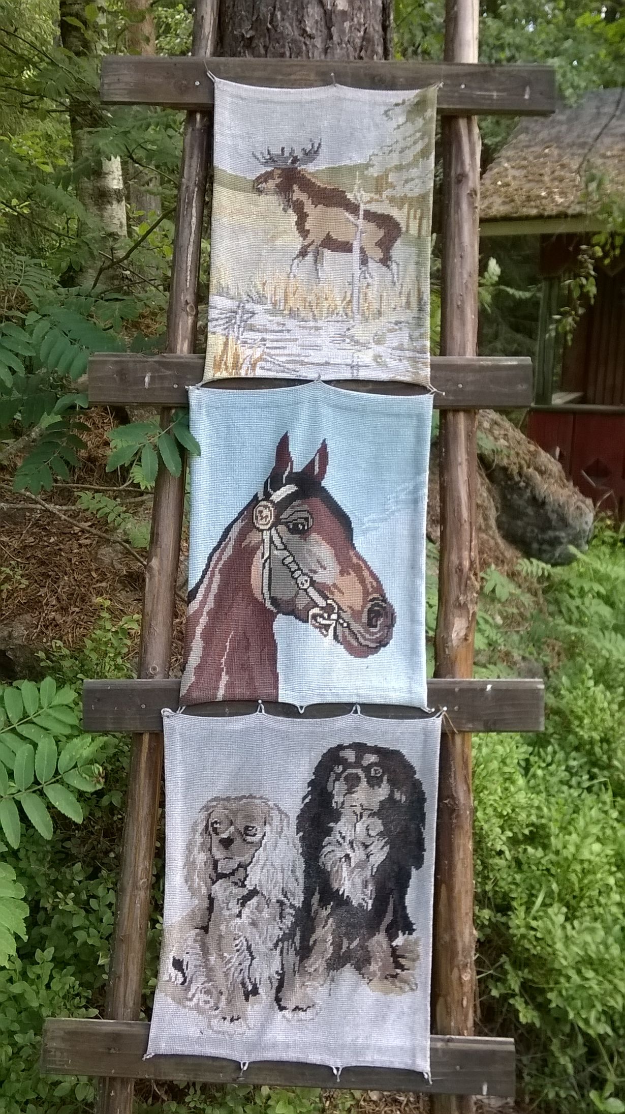 Kanavatyötaulut on laitettu mökin pihalla oleviin tikkaisiin. Siinä ne saavat olla koko kesän sateessa ja paisteessa. Talveksi koko tikkaat tauluineen nostetaan saunan pukuhuoneeseen. Kun kuvat alkavat haalistua teen uuden taulun. Seuraavaksi aion tehdä kukkatauluja! Kanavatöiden tekeminen on niin kivaa.