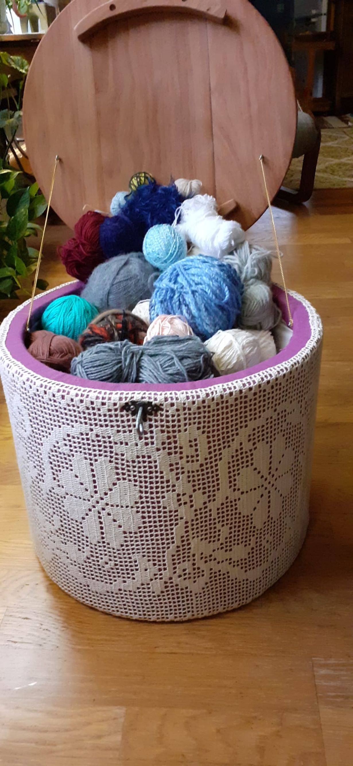 Tämä jämälanka jemma on näkyvillä keskeisellä paikalla olohuoneen lattialla. Toimii istuimen kun kansi on kiinni ja on kaunis katsella. Tämä on Äitini ja Isäni yhteistyön tulos.