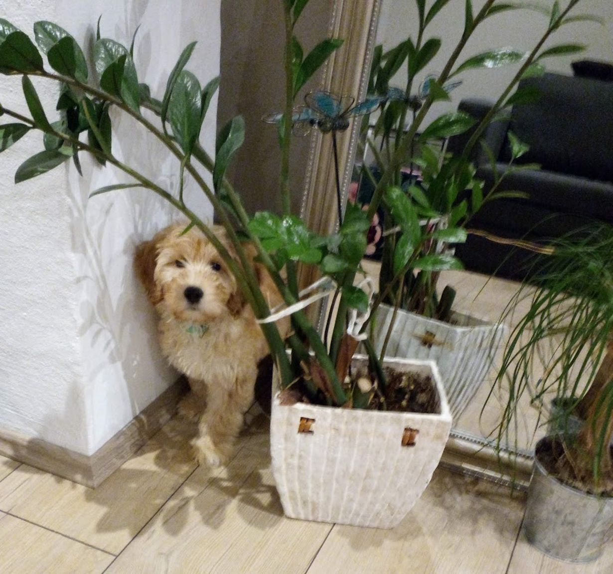 Meillä on 12vk ikäinen ALD pentu Riku. Olen päivät kokonaan kotona ja touhuan hänen kanssa päivät pitkät. Yksi lempipuuhista on "piilosta" ja Rikun lempi"piilo" on peilin ja kukkien takana, josta hänet joka kerta löytää.
