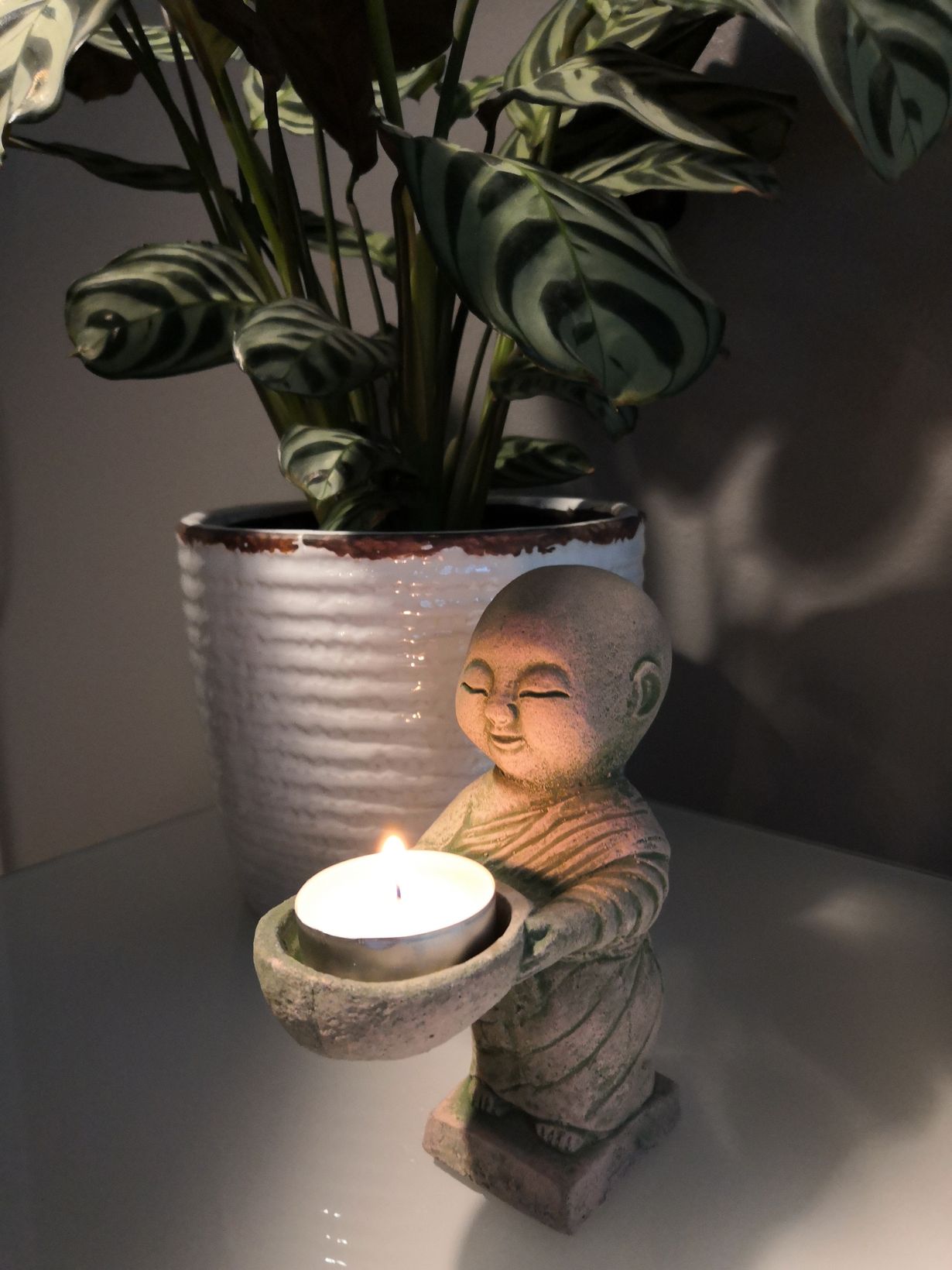 Thaimaasta matkatuliaisena tuotu keraamimen pikku buddha tuo valoa pimeyteen ja rauhoittaa mieltä onnellinen hymy kasvoillaan. Tästä tulee hyvälle mielelle joka kerran, kun sytyttää tuikun buddhan käsissä olevaan maljaan.