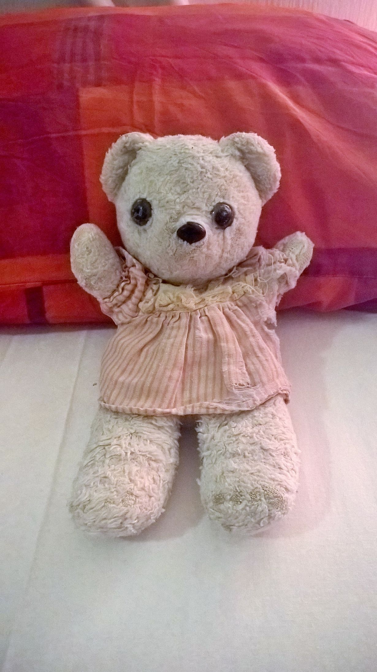 Vanha ja virttynyt Pikku-Nalle, 28 vuotta, on uinut sadevesisaavissa ja nukkunut kainalossani lähes teini-ikään asti. Nallella on Minni Hiiren mekko, vanhuuttaan kärsinyt sekin.