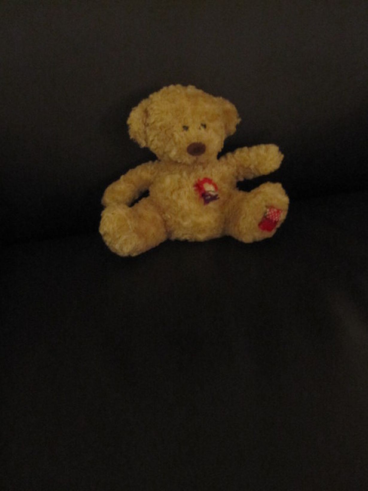Pieni beigen värinen, vähän paikattukin nallukka on isän mieleen.