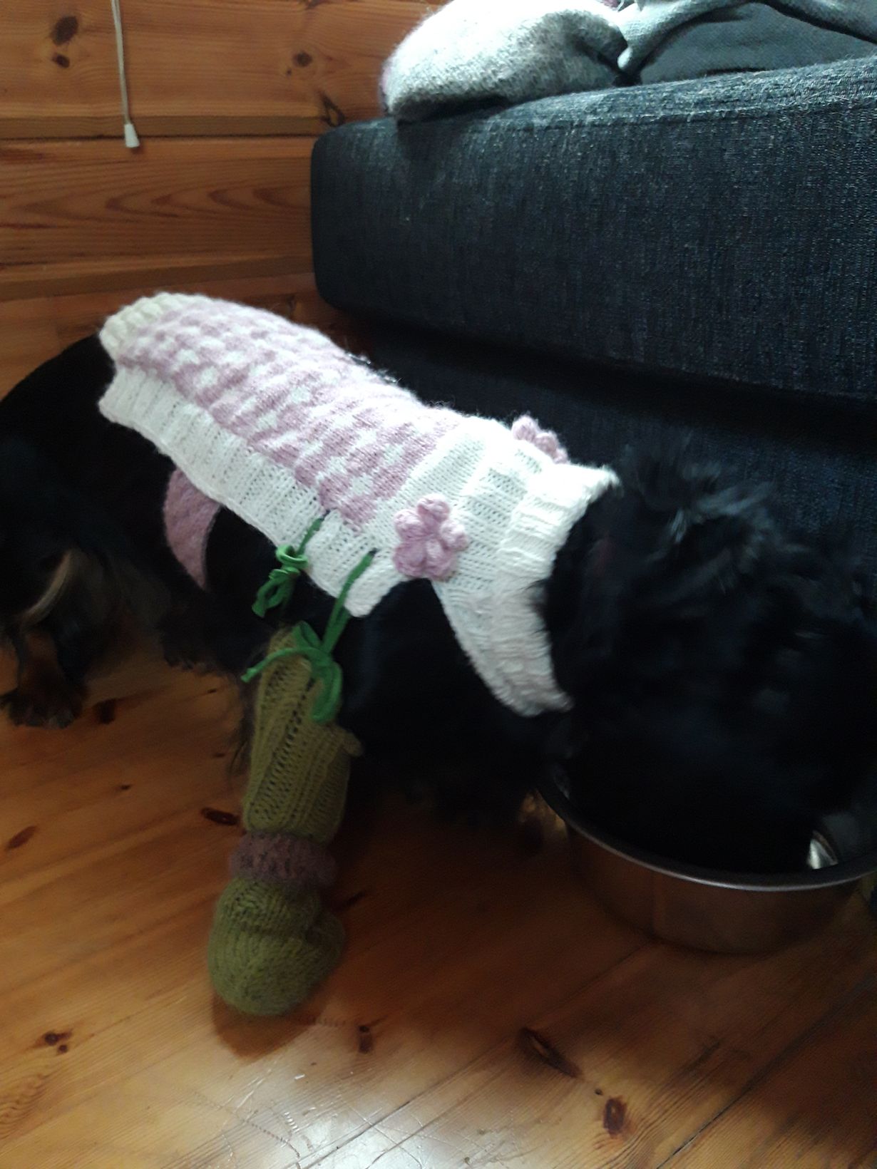 Tyttäremme teki mäyräkoirallemme neuleen, joka oli erityisen kätevä silloin kun Helinä-koirallamme oli kynsivaurio tassussaan.