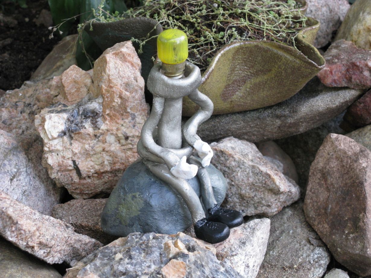 Sähköuunistani paloi lamppu. En raskinut heittää lamppua pois, koska se oli niin kivan näköinen ja aloin miettiä sille uusiokäyttöä. Sitten välähti ihan kuin Pelle Pelottomalla konsanaan: siinähän se on pikkuapulaisen pää valmiina. Ei muuta kuin seuraavana keramiikkatyönä tekemään apulaiselle vartaloa. Nyt pikkuapulainen on jo muutamia vuosia saanut istuskella kukkapenkin kiviaidalla.