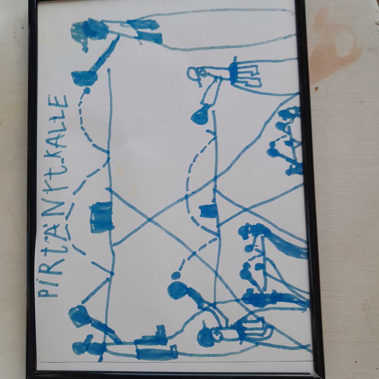 6-vuotias poikani Kalle seurasi mielellään pingisotteluita Sipoon Hindsbyn kylän kylätalolla, Byagårdenissa. Perspektiiviongelman Kalle ratkaisi nerokkaasti, muutama viiva jalkojen jatkeeksi! Toukokuussa Kalle saa tämän piirroksen lahjaksi täyttäessään 50 vuotta!