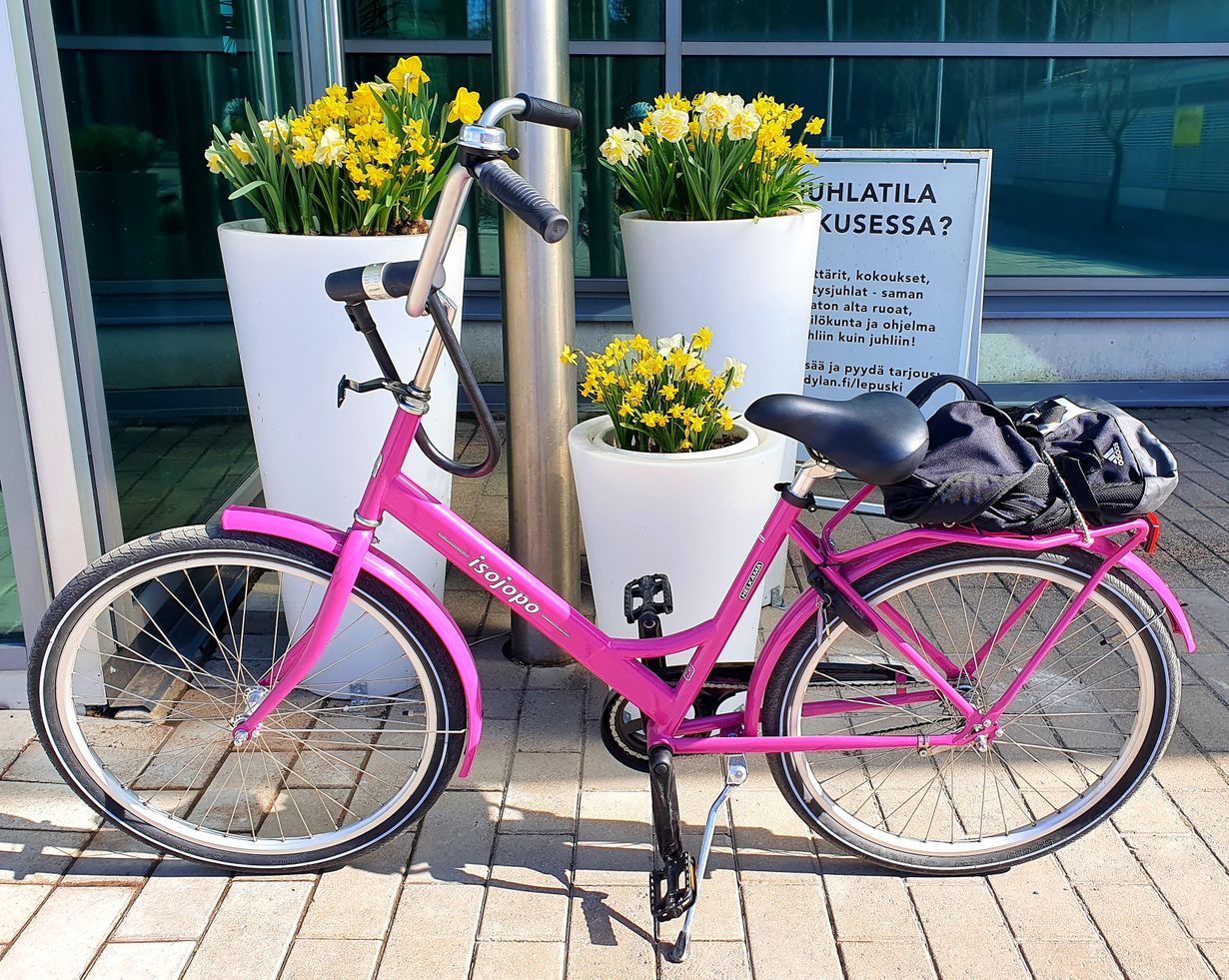 Sain kolme vuotta sitten firmalta 50 -vuotis lahjaksi pinkin Jopon. Siitä lähtien olen polkenut sillä joka paikkaan. Olen tosi ylpeä pyörästäni ja iloinen että sain tällaisen lahjan. Pyöräni on silmäteräni ja varjelen sitä tosi tarkkaan jottei joudu pitkäkyntisten käsiin. Minua ei haittaa vaihteettomuus vaan nautin hitaasta polkemisesta ja maisemien ihailusta.