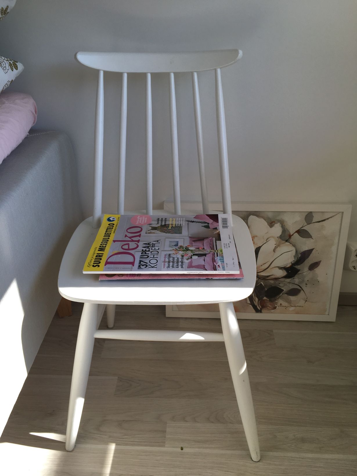 Tämän pinnatuolin löysin kirpputorilta. Uuden maalin pintaan saatuaan se on toiminut keittiön jakkarana, ja päätynyt lopulta yöpöydäkseni. Tuo mukanaan mummolafiiliksen!