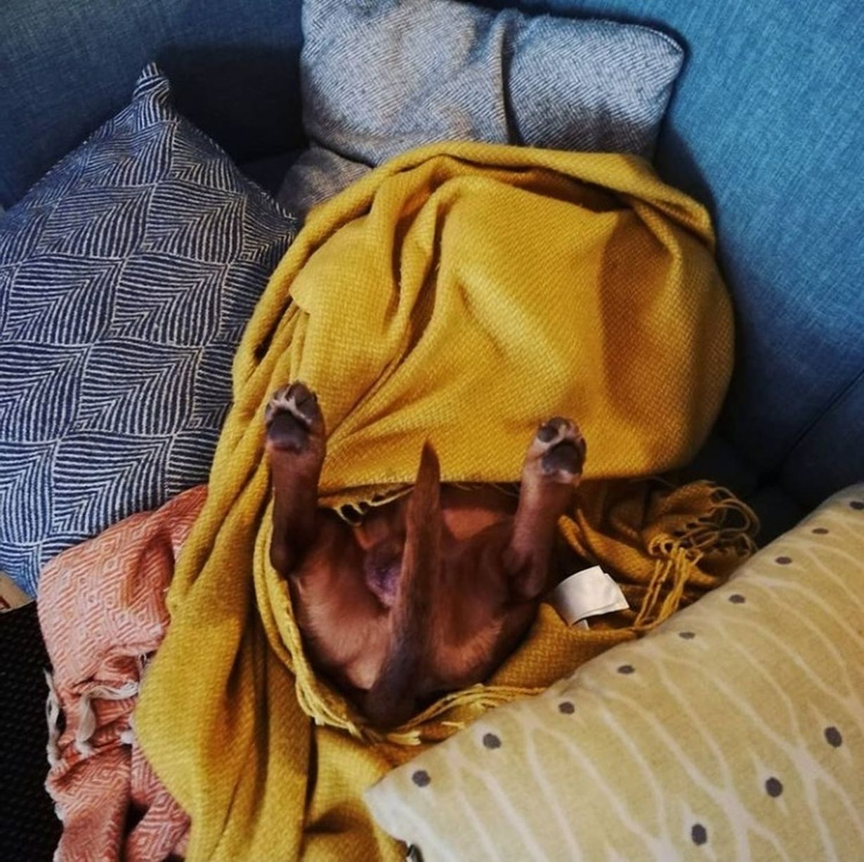 Missä mäyräkoira lymyää? Kodin pehmein paikka on yleensä hyvä veikkaus. Jos ei muuten löydy niin kuorsauksesta kyllä kuulee.