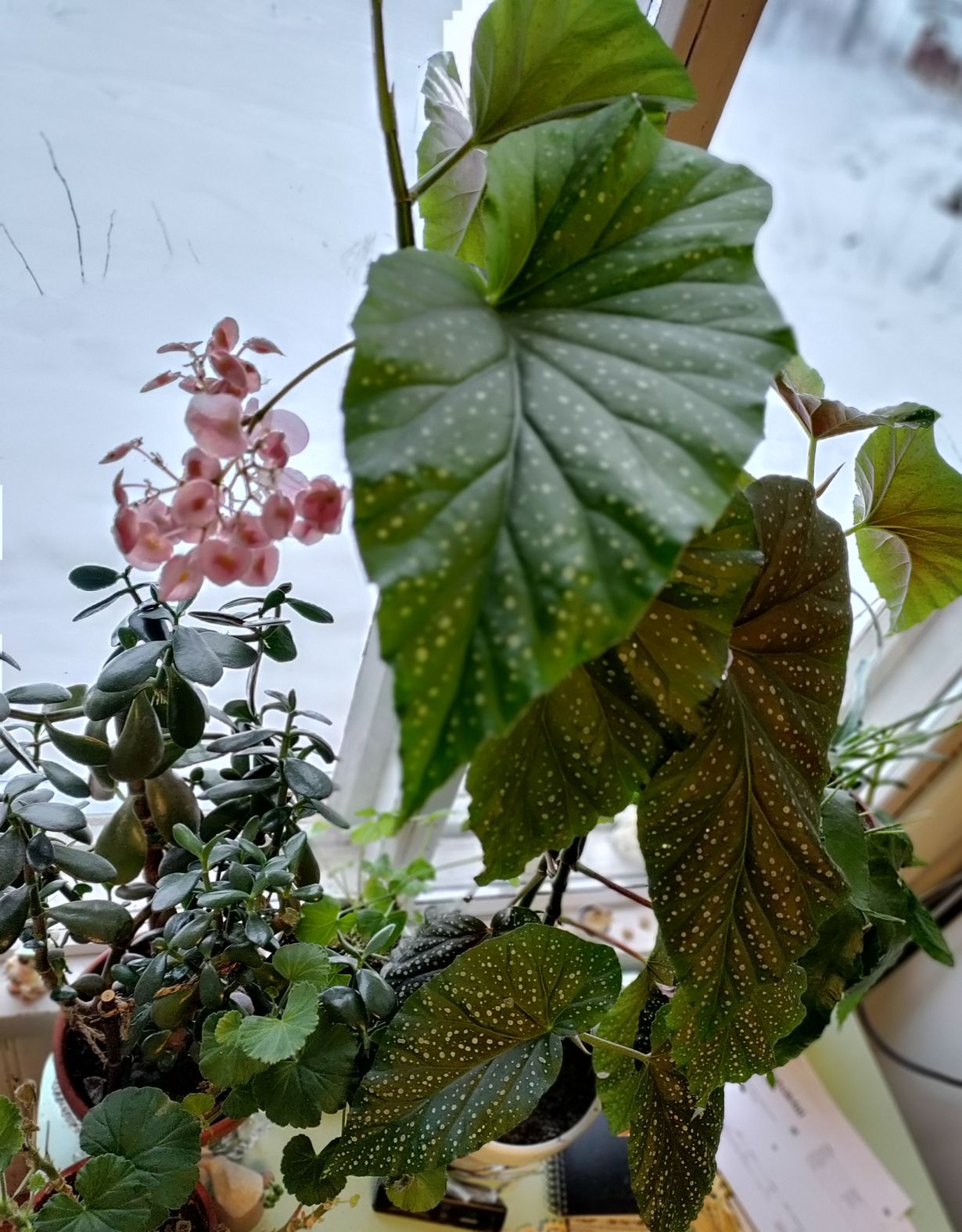 Kesällä saamani enkelinsiiven pistokas innostui hyvin kasvuun ja nyt keskellä talvea se yllätti kunnolla. Taustalla oleva rahapuu ei viihtynyt kaupungissa, mutta maalaiselämä näyttää sitäkin innostavan kasvuun. Se on pistokas todella vanhasta kasvista työpaikalta.