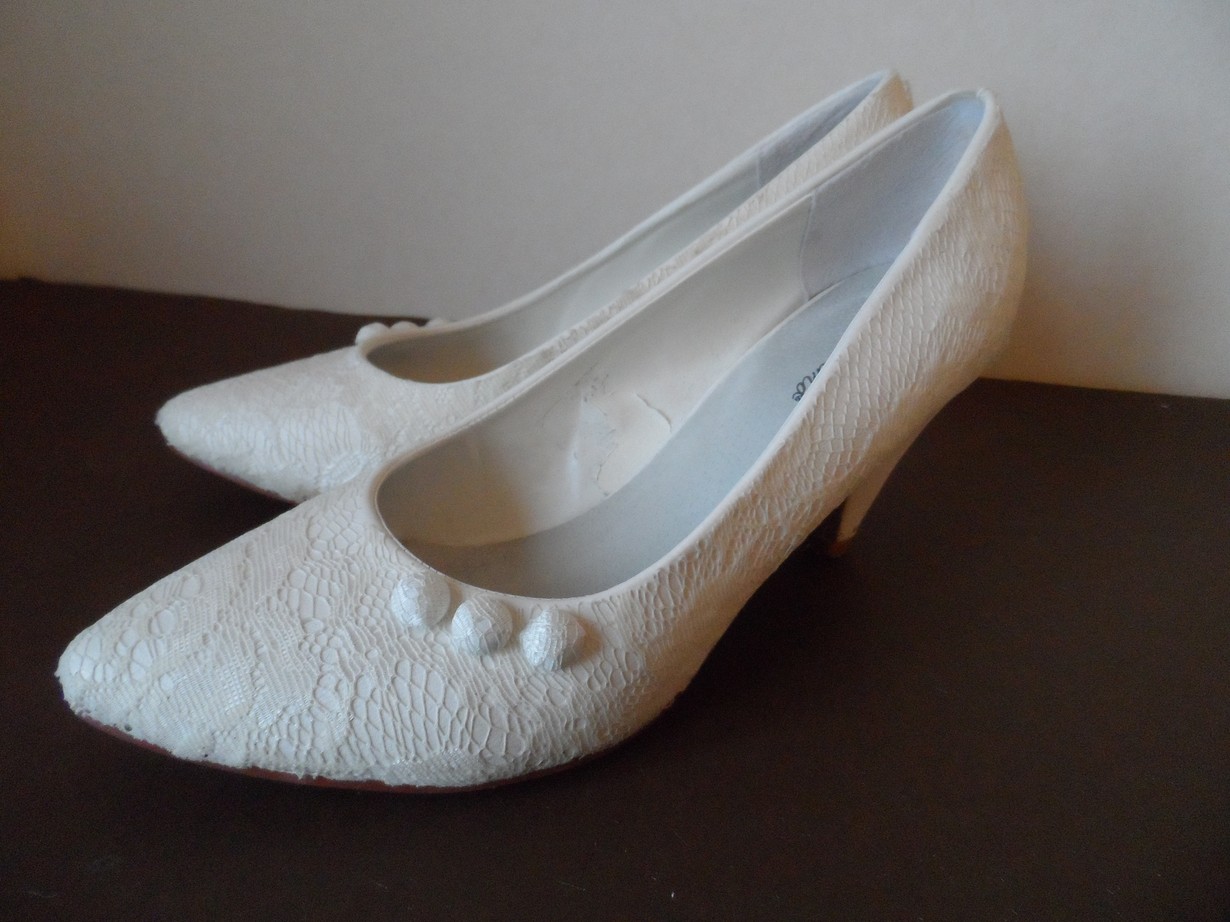 Päällystin hääkenkäni häämekkoni pitsillä. Napit on myös teetetty samasta pitsistä. Itsetekemällä sai juuri sitä mitä halusi!