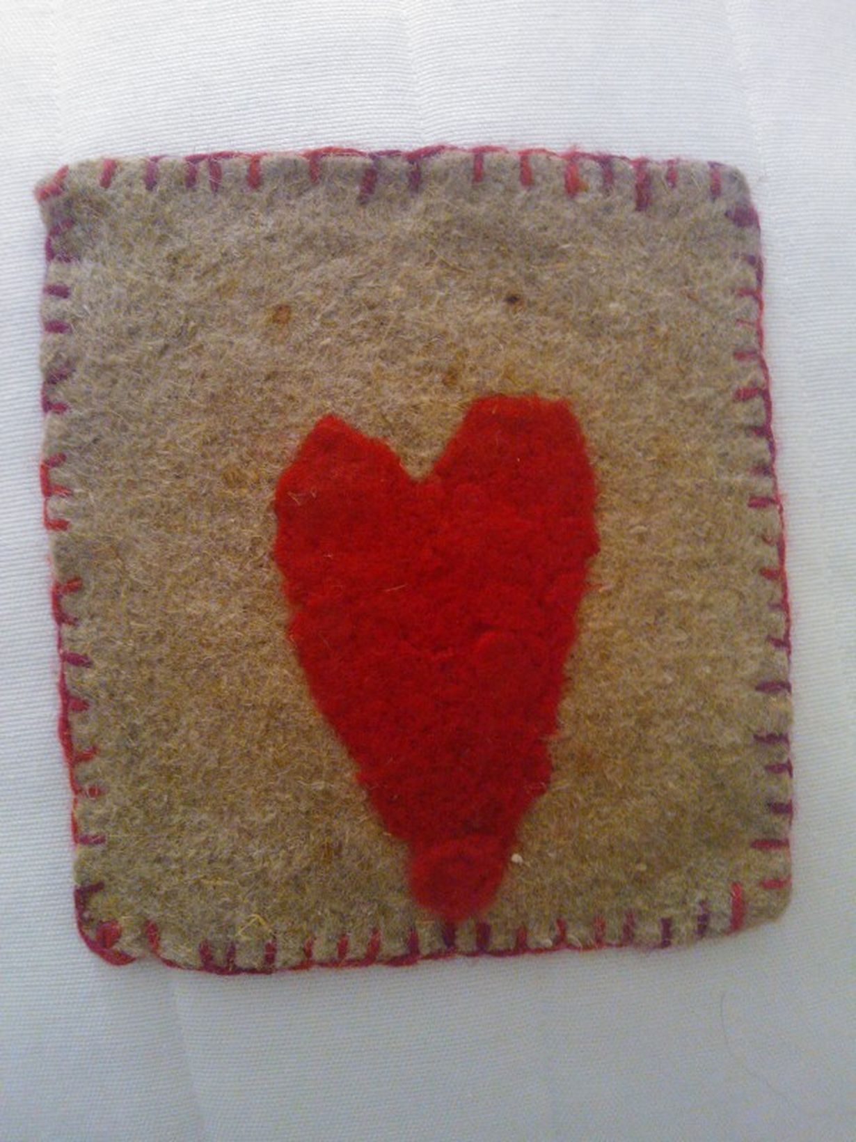 Villaan huovuttaen/pistelemällä kiinnitetty sydän. Itse pidän tässä siitä että sydän on aseteltu keskelle ennen kiinnitystä mutta kiinnitystekniikka on tehnyt tepposen ja venyttänyt kuvion lähestulkoon alareunan ohi. Tai näin minulle ainakin olisi käynyt. On vaan jotenkin niin helppo samaistua siihen hämmästyksen tunteeseen... Mitä teen, miksi tämä valuu, kuinka tämä näin menee. Lopputulos kaikesta huolimatta erinomainen ja käsintehdyn näköinen.