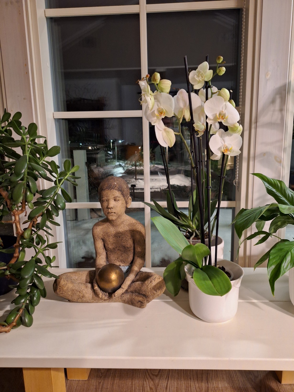 Kuvataiteilija Tarja Malisen keraamiikkaveistos. Yleensä hänen lapsi-installaatioidensa lapset ovat silmät kiinni. Pyynnöstäni sain Pojan. Hän on silmät auki, istuu kukkien keskellä kotini ikkunan ääressä.