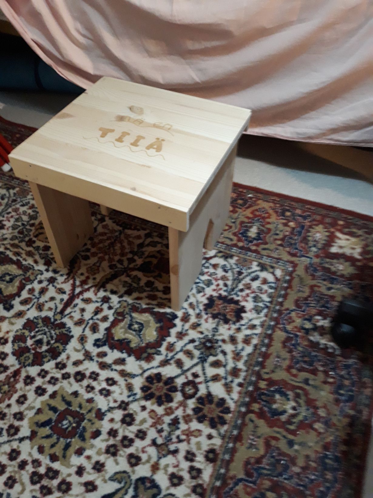 Poika teki tänä syksynä koulussa hienon puisen jakkaran, jonka päällä lukee MÄ EN TIIÄ.