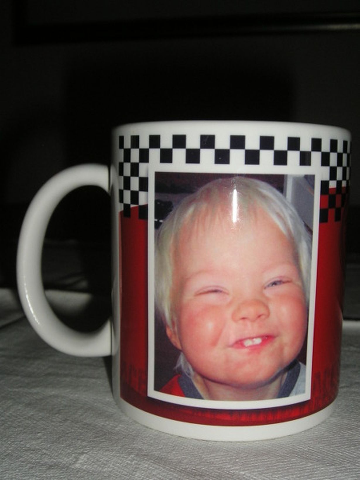 Sain kahvikupin joululahjaksi pojaltani. Siinä on pojanpojan pullukkakasvot ja hymysuu.
