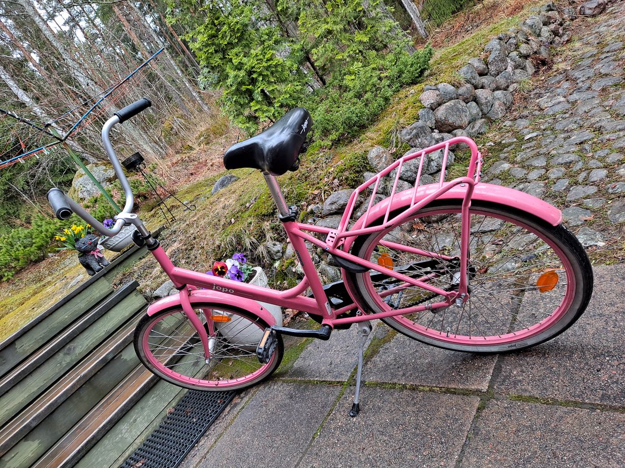 Anoppi osti tyttärelleni 10 vuotta sitten pinkin jopon. Kerran se varastettiin kaupan pihalta. Kaverin vinkistä pyörä löytyi erään kerrostalon pihalta ja kävimme hakemassa sen takaisin kotiin. Luotettava kulkupeli.