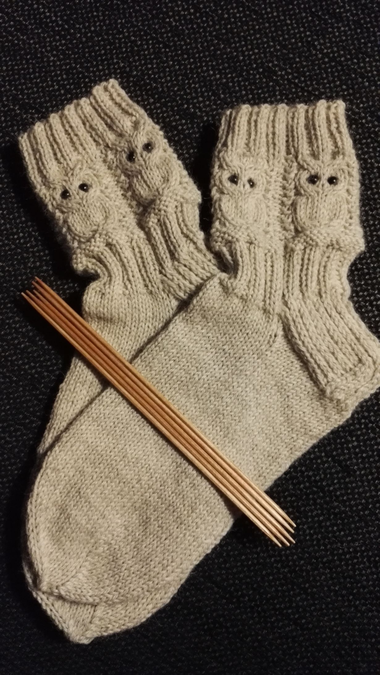 Tein elämäni ekat pöllösukat ihan testimielessä. Ne oli aika helppo tehdä. Nämä päätyivät serkkutytön jalkoja lämmittämään. Ollaan molemmat melkoisia pöllöfaneja. ❤