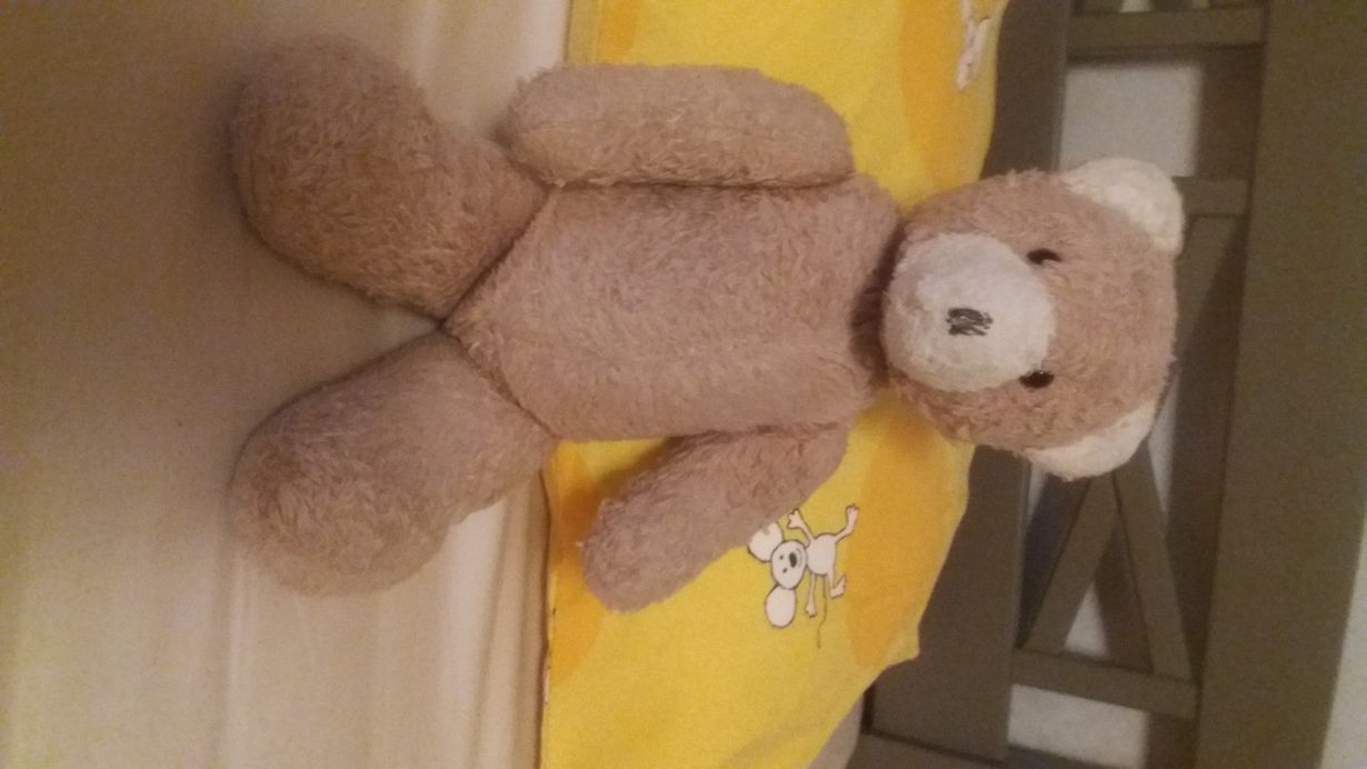 Sain tämän nallen vuonna 1964 Joululahjaksi. Sen nimi on Ponso. Se on kulkenut mukanani kaikki nämä vuodet. Silloin pikkutyttönä uitin sitä sadevesitynnyrissä ja sain siitä hyvästä äidiltäni huutia. Oma poikani oli 80-luvulla kovasti kiinnostumut sen nappisilmistä ,joten irrotin ne ja laitoin hyvään talteen. Niin hyvään ,etten koskaan enää löytänyt niitä! Vuosia myöhemmin Tampereen kauppahallista sitten löytyi nappikauppa ,josta löysin nallelleni uudet silmät!