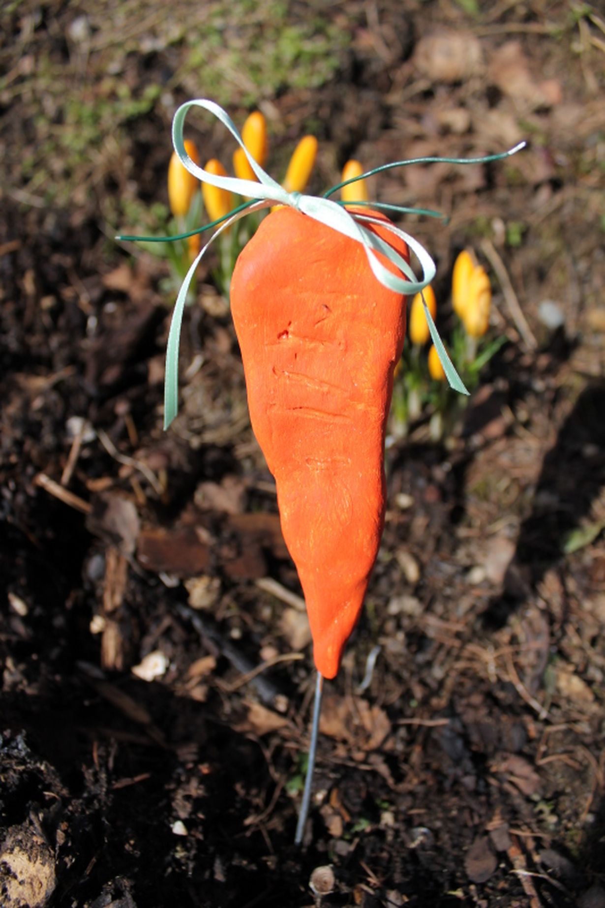Yleensä puutarhastamme löytyy vain eläviä kasveja, mutta tämän jostain massasta tehdyn porkkanapenkin merkkaajan olen saanut eskarioppilaaltani kevätlahjaksi, ja tykkään siitä.