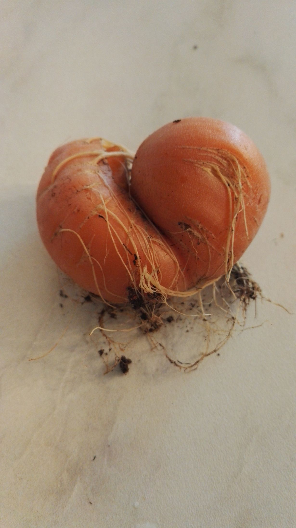 7-vuotiaan tyttäreni itse kylvämät ja kasvattamat porkkanat kärsivät matalamultaisesta kasvualustasta. Tuloksena oli kaksinkertaisia porkkanoita.