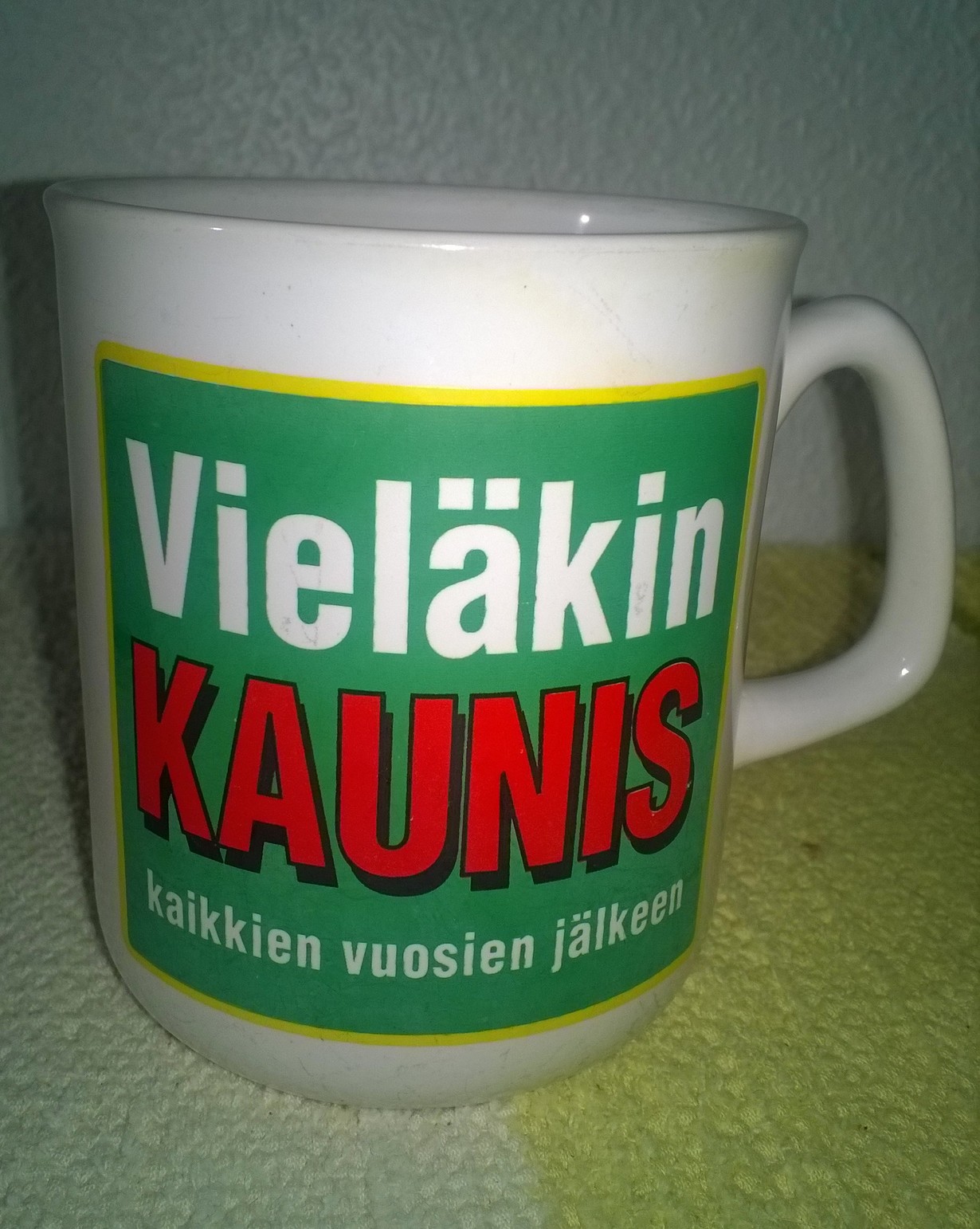 Tämän mukin sain lapsiltani äitienpäivälahjaksi kymmenkunta vuotta sitten. Kyllä aamuisin hymyilyttää, kun otan mukin käyttööni aamukahville, sillä ikääntymisen merkit jo näkyvät kasvoilla.