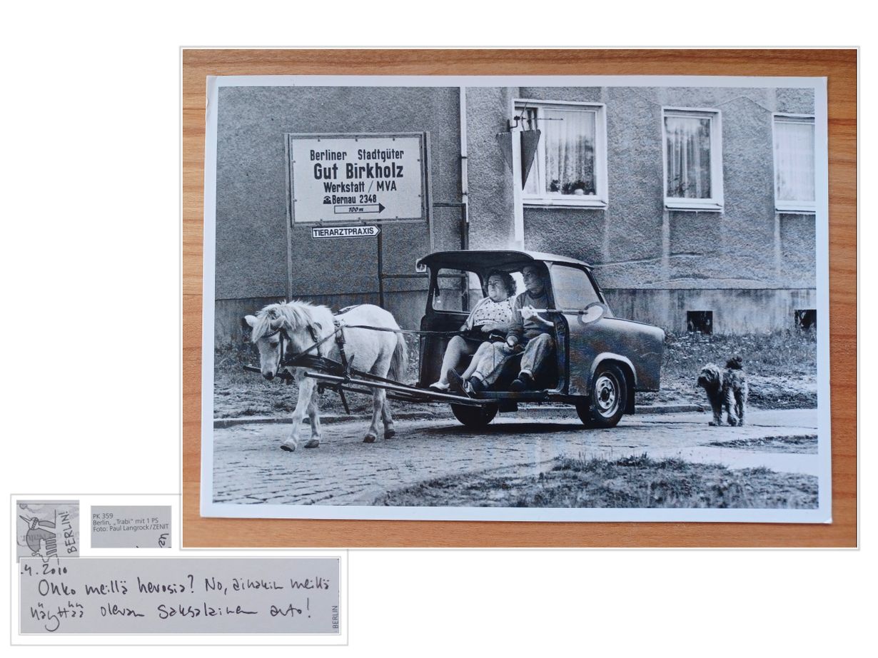 Tyttären 2010 lähettämä postikortti Berliinistä. (Lause "Meill ei ooo hevosia..." on perheen inside-muistoja lasten lapsuudesta.)