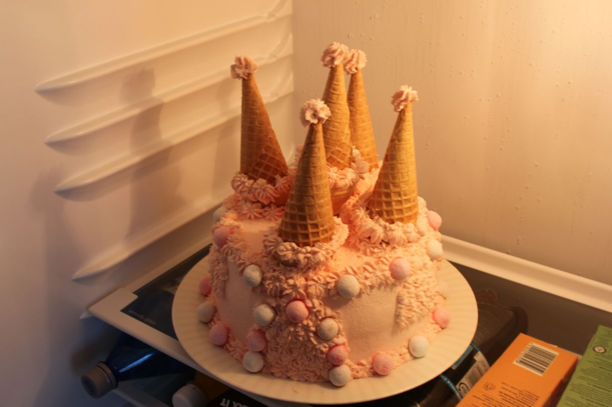 Tyttäreni täyttäessä 7- vuotta, hän sanoi, että haluaa Prinsessalinna- kakun. No äiti sitä sitten kyhäämään ja tällainen siitä tuli. (Kuva on otettu jääkaapissa, joten ei ehkä ihan paras mahdollinen. :) )