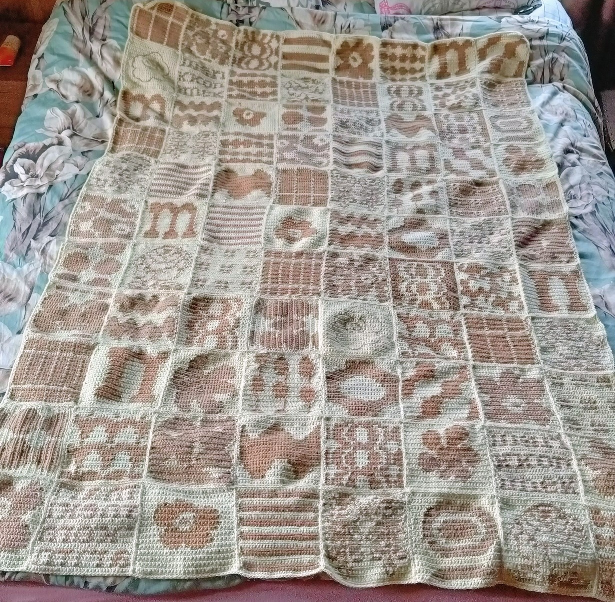 Paljon on tullut tehtyä kaikenlaisia käsitöitä ja on vaikea valita, mikä on merkityksellisin. Tämä tyttären toiveesta tehty neulottu, Marimekon kuvioista kasattu torkkupeitto on kuitenkin kaikista suuritöisin ja tyttärelle rakas.