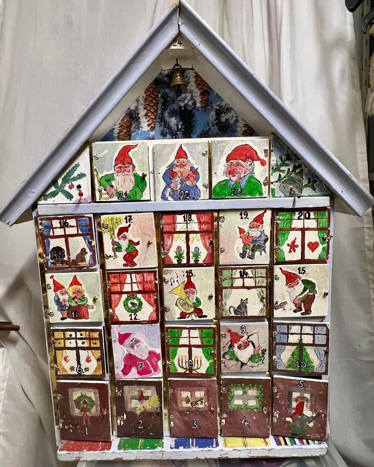 Isäni teki meille lapsille 80-luvun alussa tämän ihanan puisen n. metrin korkuisen joulukalenterin. Hän maalasi luukkuihin jouluisia kuvia ja asensi veivattavat soittorasiat yläkulmiin. Joulukalenteri on ilostuttanut lapsia ja lapsenlapsia joka joulukuu vuosikymmenien ajan.