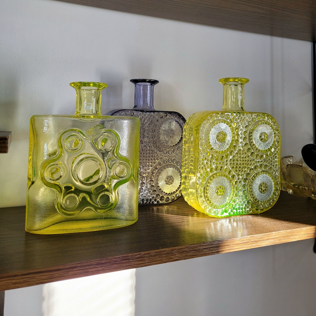 Taustalla oleva neodyymin värinen Grapponia-pullo on saatu edesmenneeltä isoäidiltäni jo yli kaksikymmentä vuotta sitten. Se oli vuosikausia ainut kotimme koristepullo. Edessä olevat keltaiset pullot ovat päätyneet meille ystävän ja hyvän kirppisonnen kautta aivan lähivuosina.