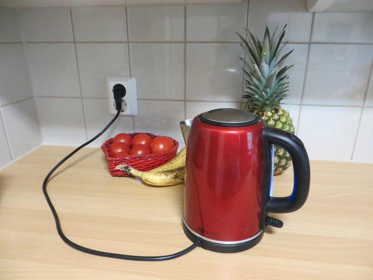 Tärkein kodinkoneemme on kuvan vedenkeitin, punainen posottaja. Se on ahkerassa käytössä, sillä 20 vuotta vanha sähkölietemme on käynyt hitaaksi. Ruuanlaittaja ei jaksa odottaa veden kiehumista kattilassa hellan levyllä. Punainen posottaja poistaa pulman!