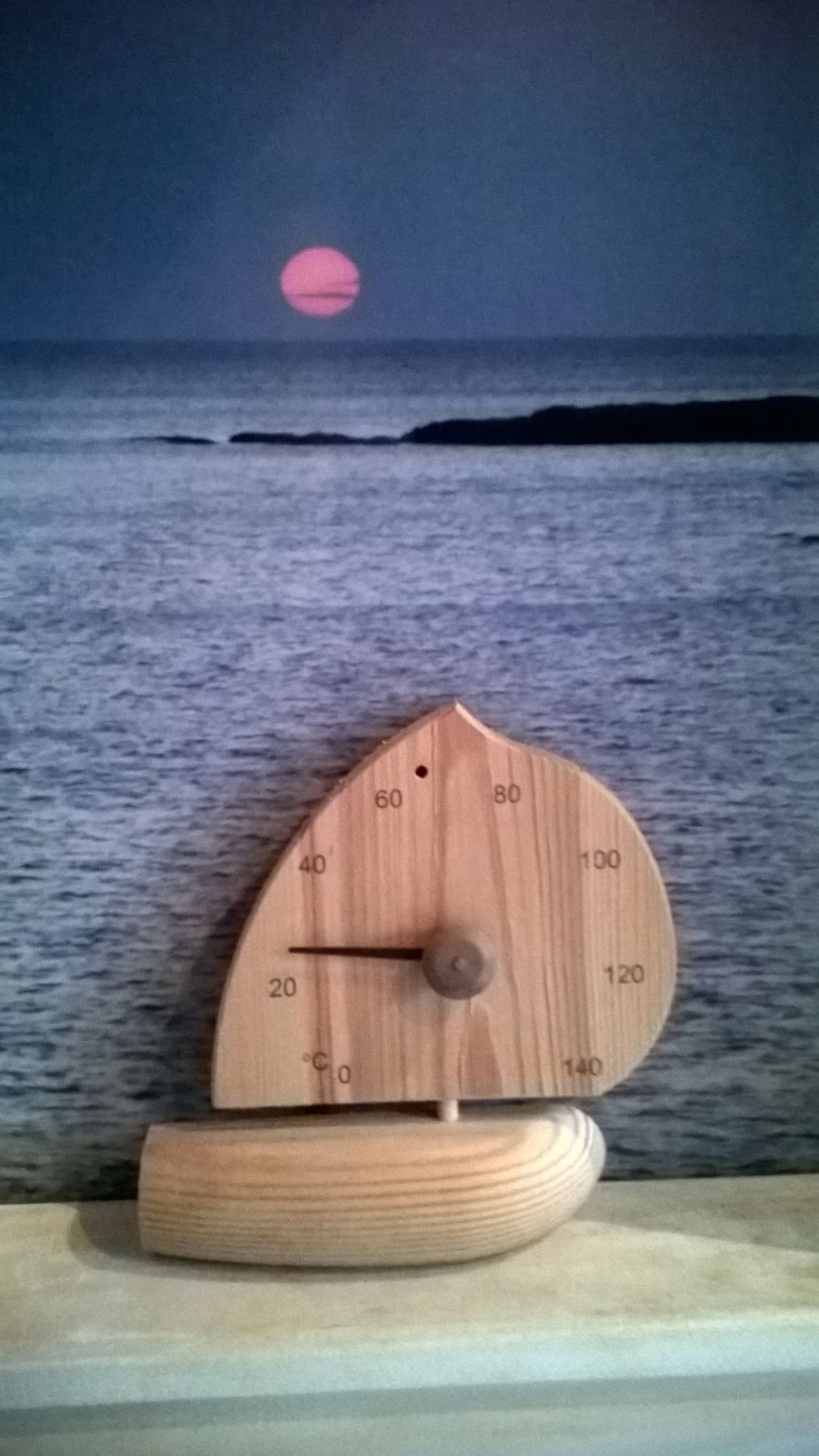 Saunassamme on valeikkuna, jossa on meriaiheinen taustakuva. Purjevene-löylymittarimme seilaa tuolla merellä kesäisistä hetkistä muistuttaen.