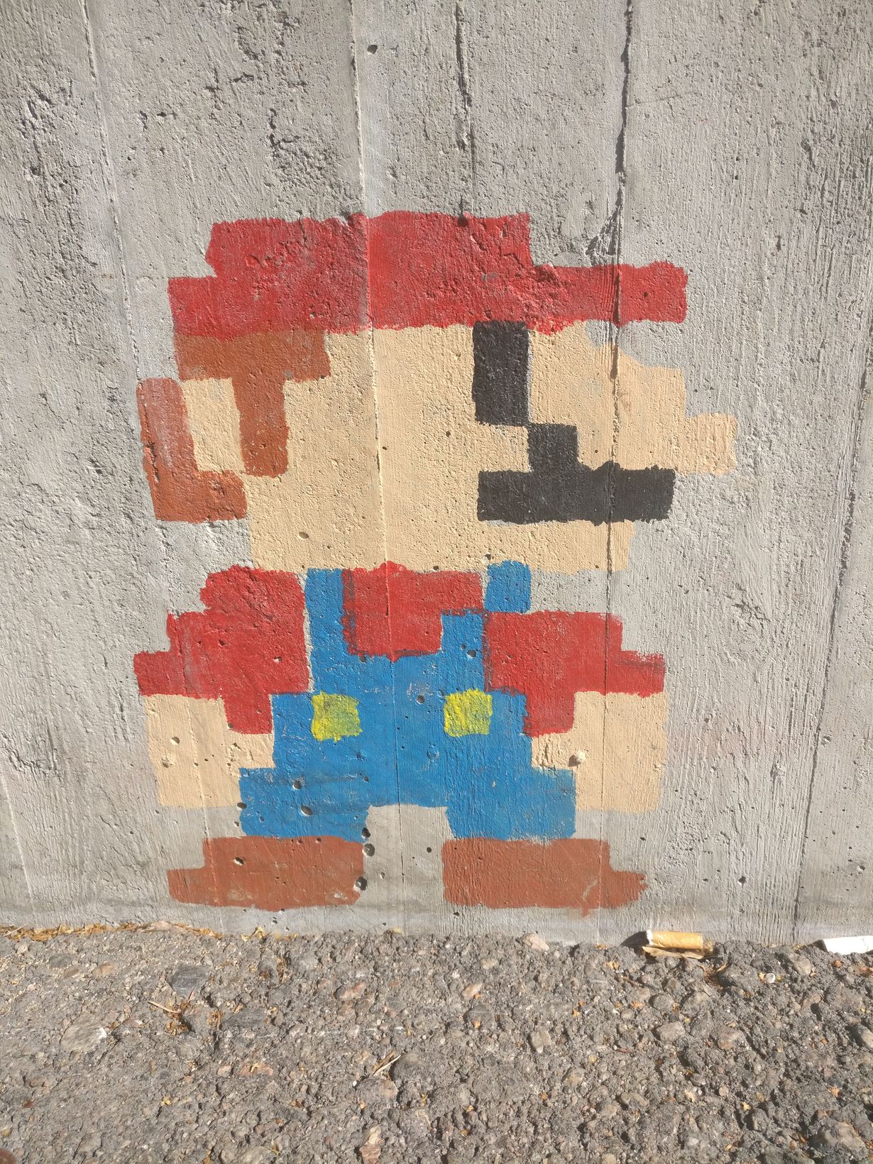 Mökkireissulla pysähdyttiin hakemaan geokätköä eräällä kylällä ja kätkö sijaitsi rakennuksella jonka sokkeliin joku oli taiteillut tämän. Söpö pieni Mario.