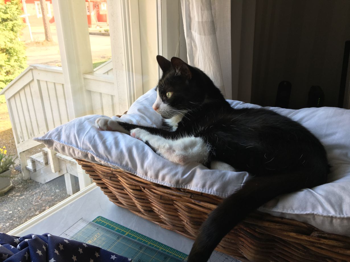 Meidän jo edesmenneen Putti-herran peti mamman ompelupöydän ääressä. Tässä oli pehmoinen löhöillä ja katsella pihan lintuja samalla olla lähellä mammaa.
