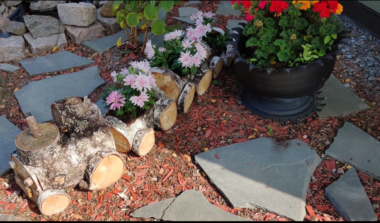 Etupihan koristeeksi tehty puujuna kukkasilla. Kaadettiin pihasta koivu ja kukkaruukkuja uupui kesäkukilta niin muutamasta koivupöllistä tehty juna ja saman puun oksista sahattu pyörät. Oli mieheni ja minun sekä lasten yhden illan askartelu ja koristi pihaa koko kesän,kunnes poltettiin takassa syksyllä.