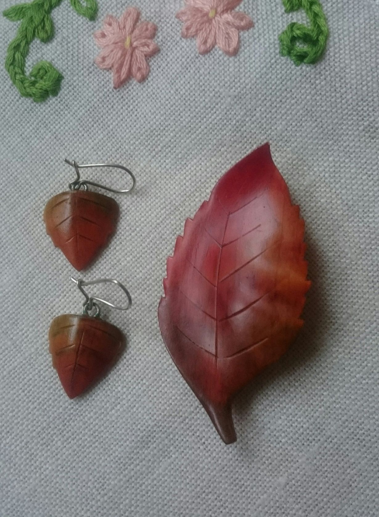 Karjalan kauniit puukorut ovat minulle mieluisat. Nämä korvakorut ja rintaneula ostettiin lomamatkalla, muistoksi syksyisestä hääpäivästä.