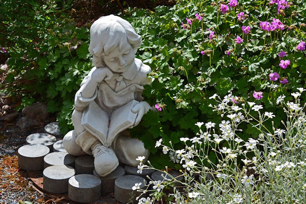 Tyttäreni oli kova lukija. Kävin hänen kanssaan puutarhakaupassa ja heti kun hän näki tämän lukijapatsaan, hän totesi, että tuon hän haluaa. Lukija sai nimekseen Sana-Seppo. Tyttäreni kuoli viisi vuotta sitten ja yhä edelleen Sana-Seppo lukee puutarhassa ja tuo mieleen rakkaan tyttäremme.