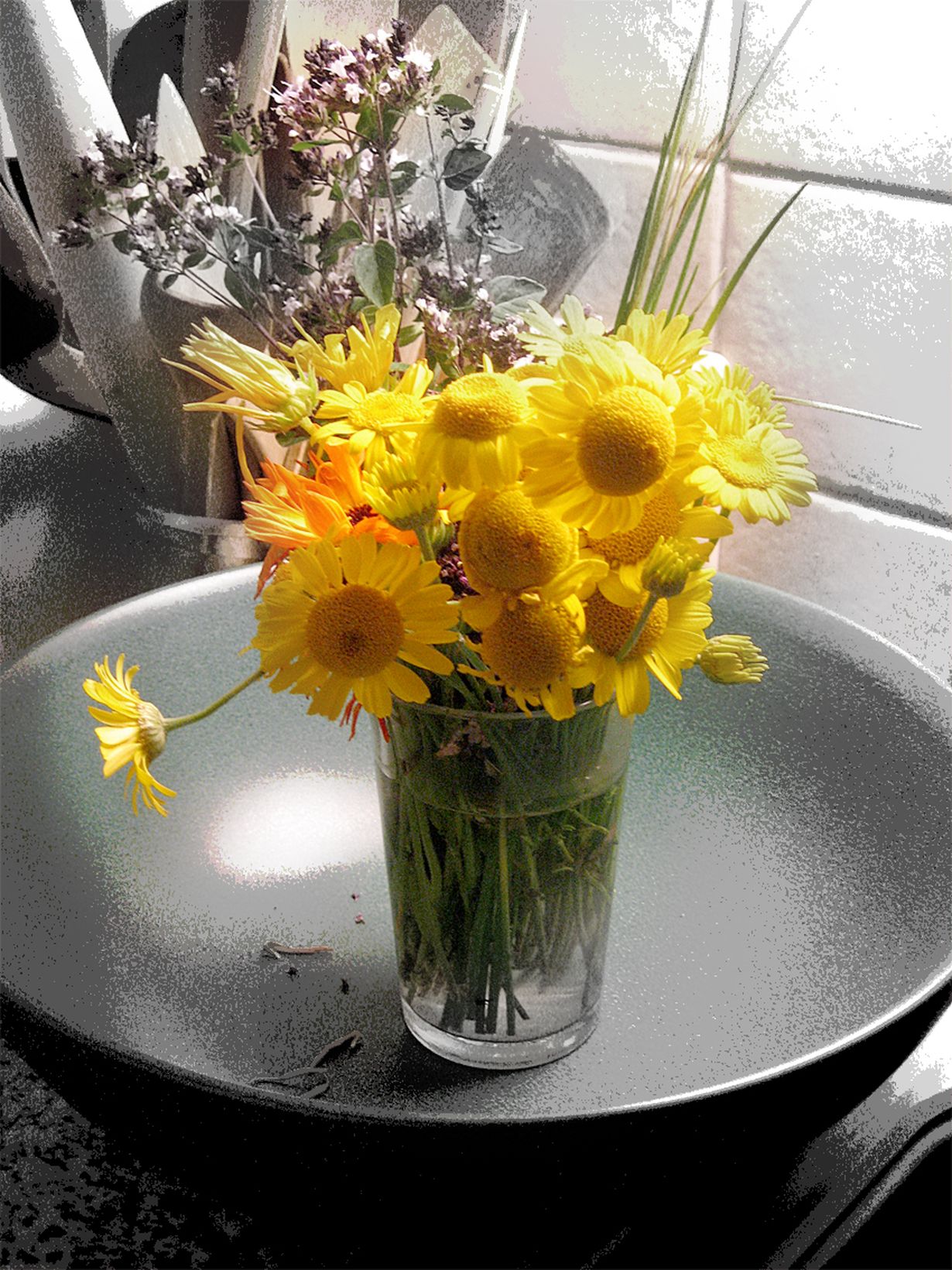 Tämä ihana arki: kukkamaljakko Puutarhasaalis 6.4.2013 klo 23:15 Oregano, ruohosipuli ja kehäkukka, vähän muutakin kukkaa, teetä, ruokaa ja silmänruokaa. puutarhuri