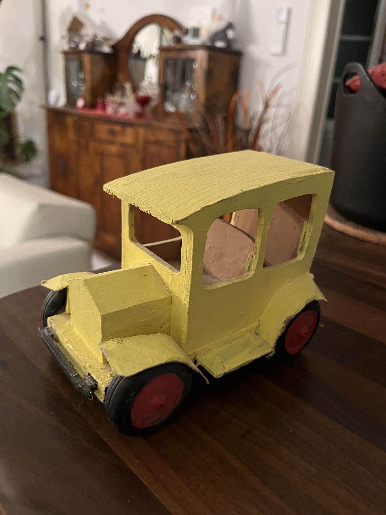 Noin 11-vuotiaina saimme valita käsityön sijaan puutyön ( ihanaa, koska inhosin käsityötä). Siellä valmistin mm. tämän vanhanaikaisen auton vanerista, pahvista ja valmiista puu”napeista”.