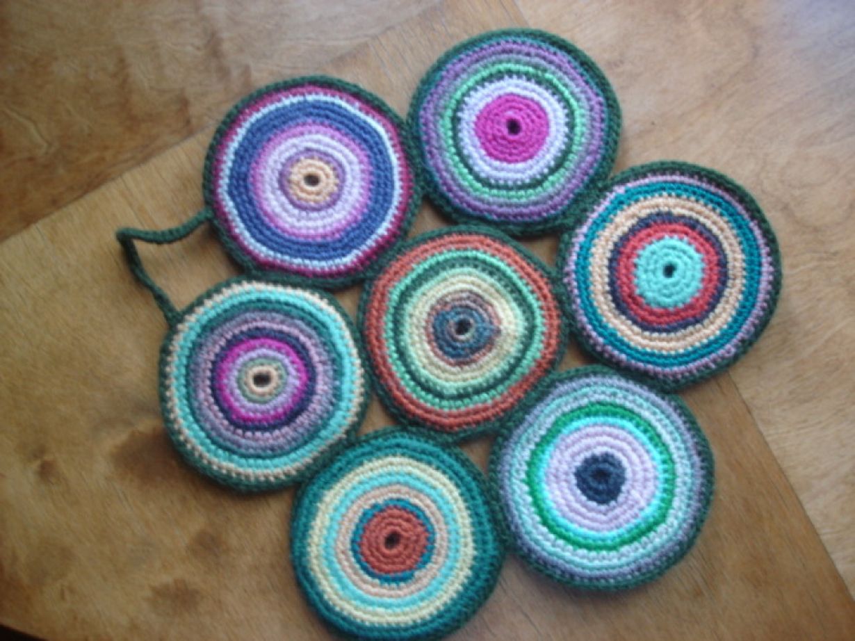 Tämä ihana arki: pannunalunen pyörylät 20.8.2012 klo 20:31 Pyörylät virkattu jämälangoista. Toinen puoli yksivärisestä langasta ja pyörylät yhdistetty virkkaamalla. Marketta