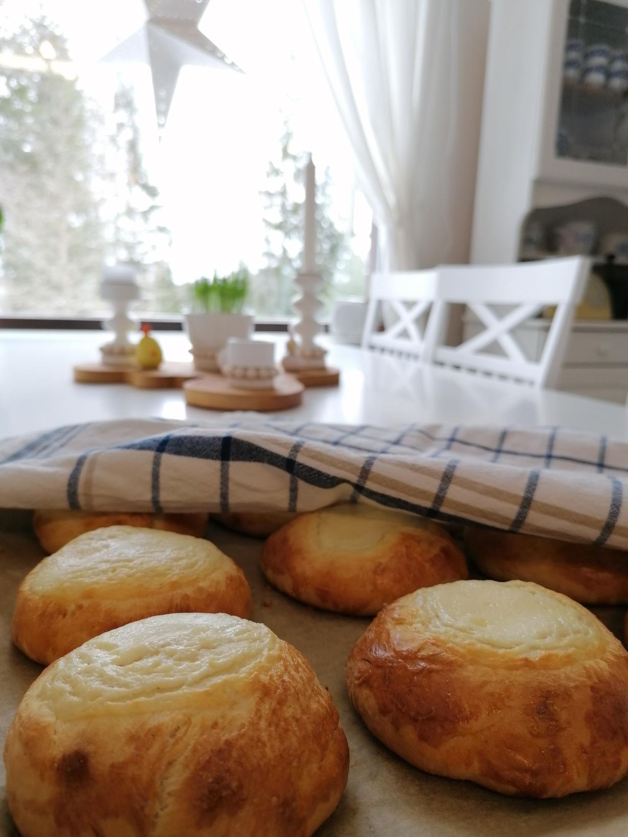 Rahkapullia tulee usein tehtyä kun talvi alkaa taipumaan kevään tieltä. Ripaus sitruunamehua täytteeseen ja kevätfiilis on taattu. Lähikaupasta keltaisia tulppaaneita maljakkoon ja kahvinkeitin päälle. Näitä ehtii leipomaan arjen keskelläkin.
