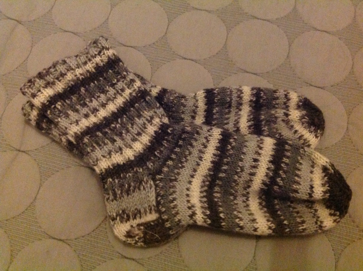Neuloin nämä sukat yhteistyössä äitini kanssa, kun olin hänen luonaan käymässä. Näitä on nyt pidetty pari vuotta ja pesty kolmenkympin villapesuohjelmalla lukuisat kerrat. Pidän villasukkia kotona päivittäin ja pakkaspäivinä joskus nukkuessakin. Nämä ovat villasukistani minulle rakkaimmat.
