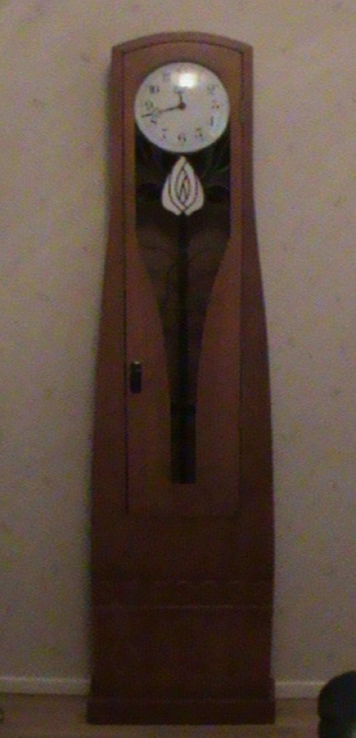 muistutuksena ajan rajallisuudesta.Alkuperäisestä kellosta oli n. 15v sitten juttu ja kuva jossain lehdessä ja heti tiesin ,että jonain päivänä minulla olisi saman mallinen kello.Korkeutta on 196cm eli sama kuin Könnikelloilla on mutta mallin tein suurentamalla 4x11cm kuvaa hieman monistuskoneella ja sitten laskemalla ja mittaamalla moneenkertaan.Alkuperäisessä kellossa oli hedelmiä tiffanylasityössä mutta halusin itse erilaisen,ehkä oman näköisemmän.Tiffanykoristeen oveen olen tehnyt myös itse.