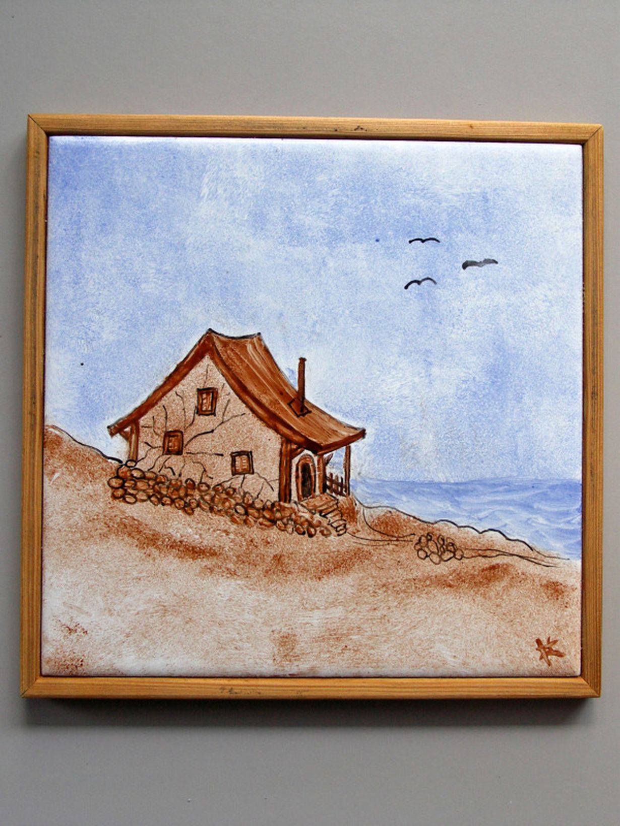 Posliininmaalauskurssilla v. 1991 mallista maalaamani harjoitelma. Osoittautui, että olin puuhassa aivan hirveän huono, mutta tästä kömpelöstä ensityöstä tuli niin rakas, että aamupuurokattilan alla pitää olla aina juuri tämä.