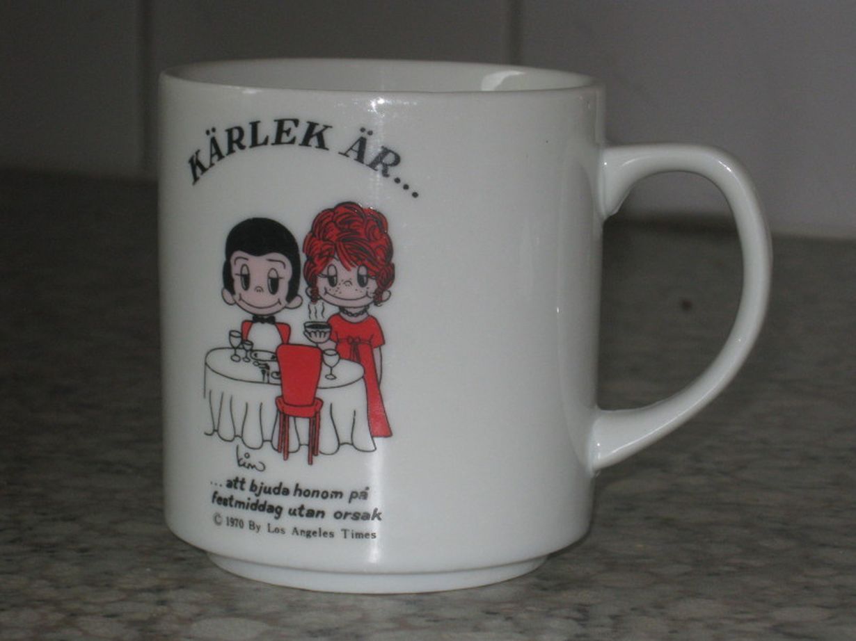 Ostin tämän kupin asuessani nuorena tyttönä Ruotsissa joskus 1970-luvun lopussa. Se on kulkenut matkassani siitä lähtien ja pidän sitä erityisen varovasti. Kupissa on teksi "Kärlek är, att bjuda honom på festmiddag utan orsak". Näitä kuppeja on minulla tallessa toinenkin, yhtä rakas. Kun käytän tai näen kupit, minulle tulee mieleen muistoja Ruotsissa asumisesta, työssä olemisesta ja tunnelmasta siellä, ystävistä.