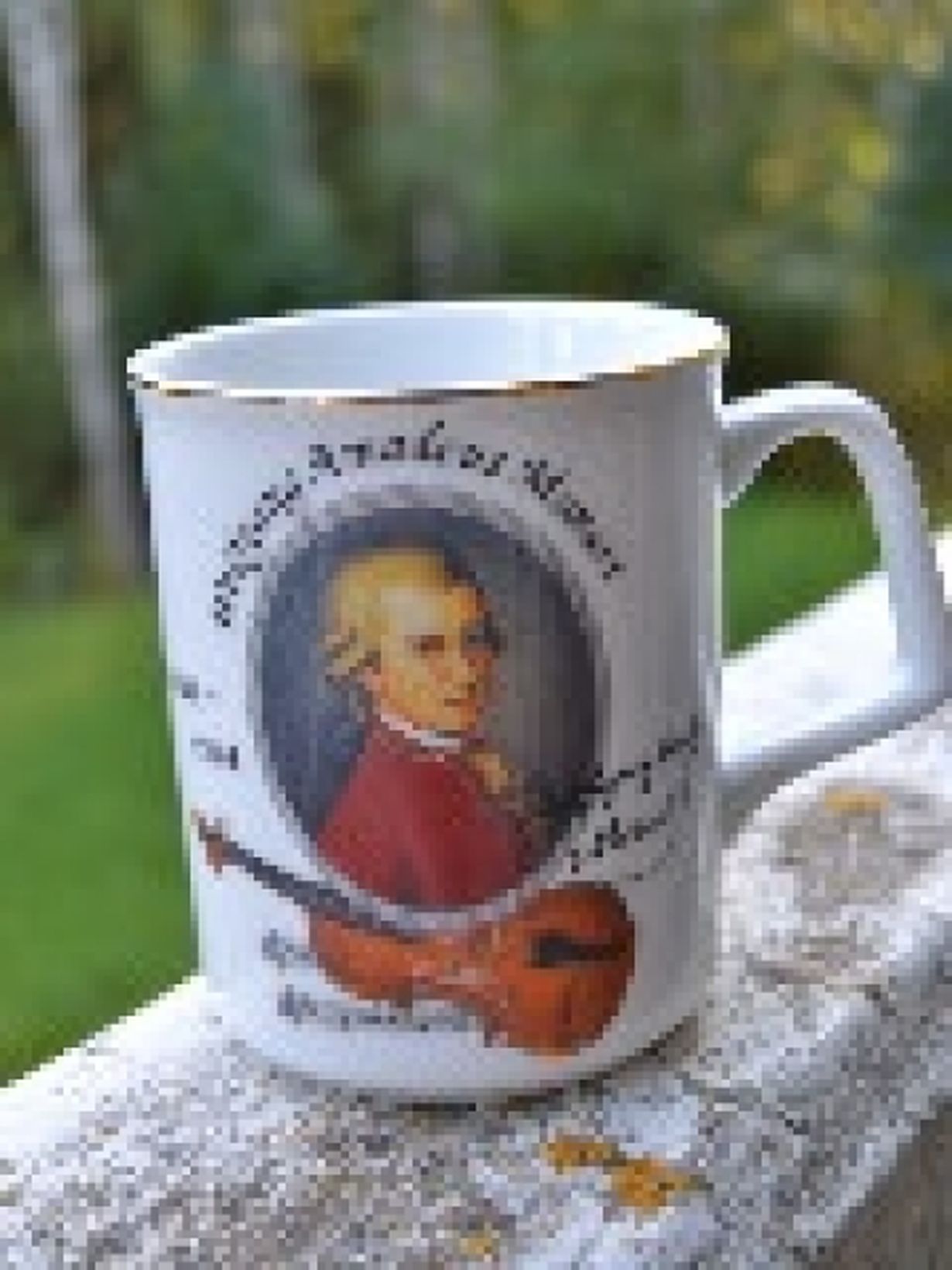 Ostin kupin Wienistä enkä ostanut ihan mitä tahansa kuppia. Koko kolme päivää minkä kaupungissa vietimme etsiskelin Mozart aiheista kuppia. Tyttäreni silloin 13v alkoi tuskastua mozart-villitykseeni. Ja voi sitä onnea kun juuri oikeanlainen kuppi löytyi. Alkuun pesin kupin aina käsin, olihan siinä kultareunukset ja kaikki. No, pari kuukautta sitä jaksoin, nyt kuppi menee jo sujuvasti muiden mukana pesukoneeseen, mutta rakas se on silti. Auta armias jos se joku ruma päivä vielä hajoaa! Kuten lähellä oli kuvauskulmaa etsiessä.