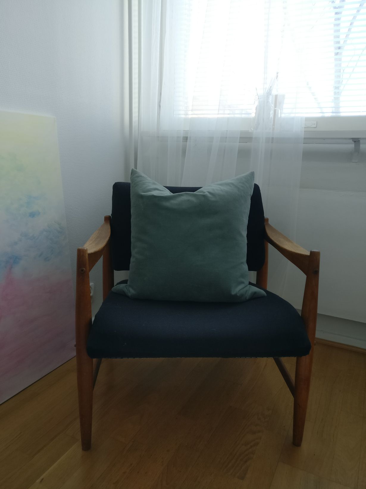 Torin kätköistä löytyi vanha puhki-istuttu nojatuoli, joka sai uuden ilmeen uudella verhoilulla ja istuintyynyjen vaihdolla. Entistä rakkaamman tuolista tekee se, että kunnostin tuolin alusta alkaen itse