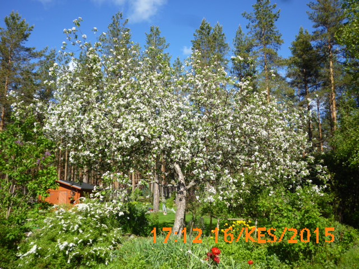 Tämä naapurin 20 v sitten maahan kaatunut, ylös nostettu ja parruilla tuettu syyskaneli antaa mahtavat sadot ja ihanan varjoisan lukupaikan helteillä. Se on kokonaan "kaatunut" meidän puolelle mutta ei haittaa ketään.
