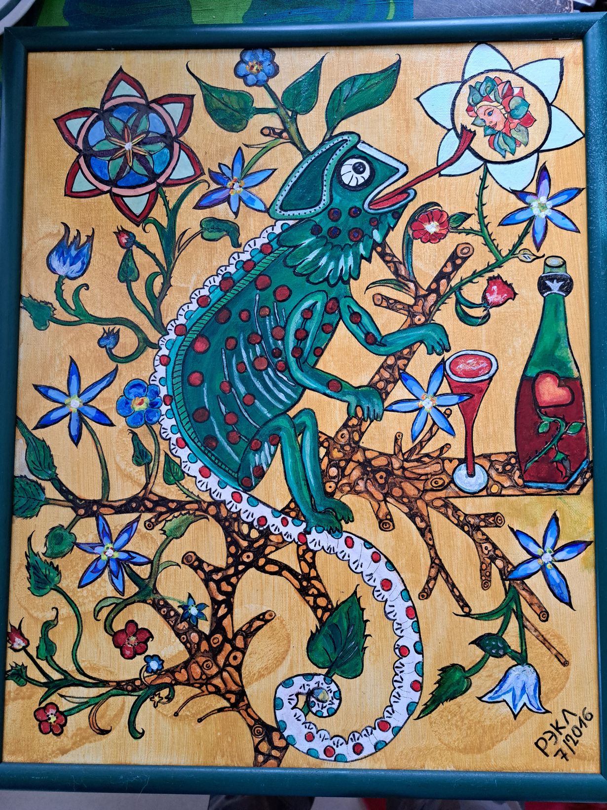 Rakas ystäväni, Petra Dobrudcha Bulgariassa, on maalannut tämän taulun, jossa OTTO-lisko muistuttaa minua päivittäin huomioimaan elämän pienet nautinnot.