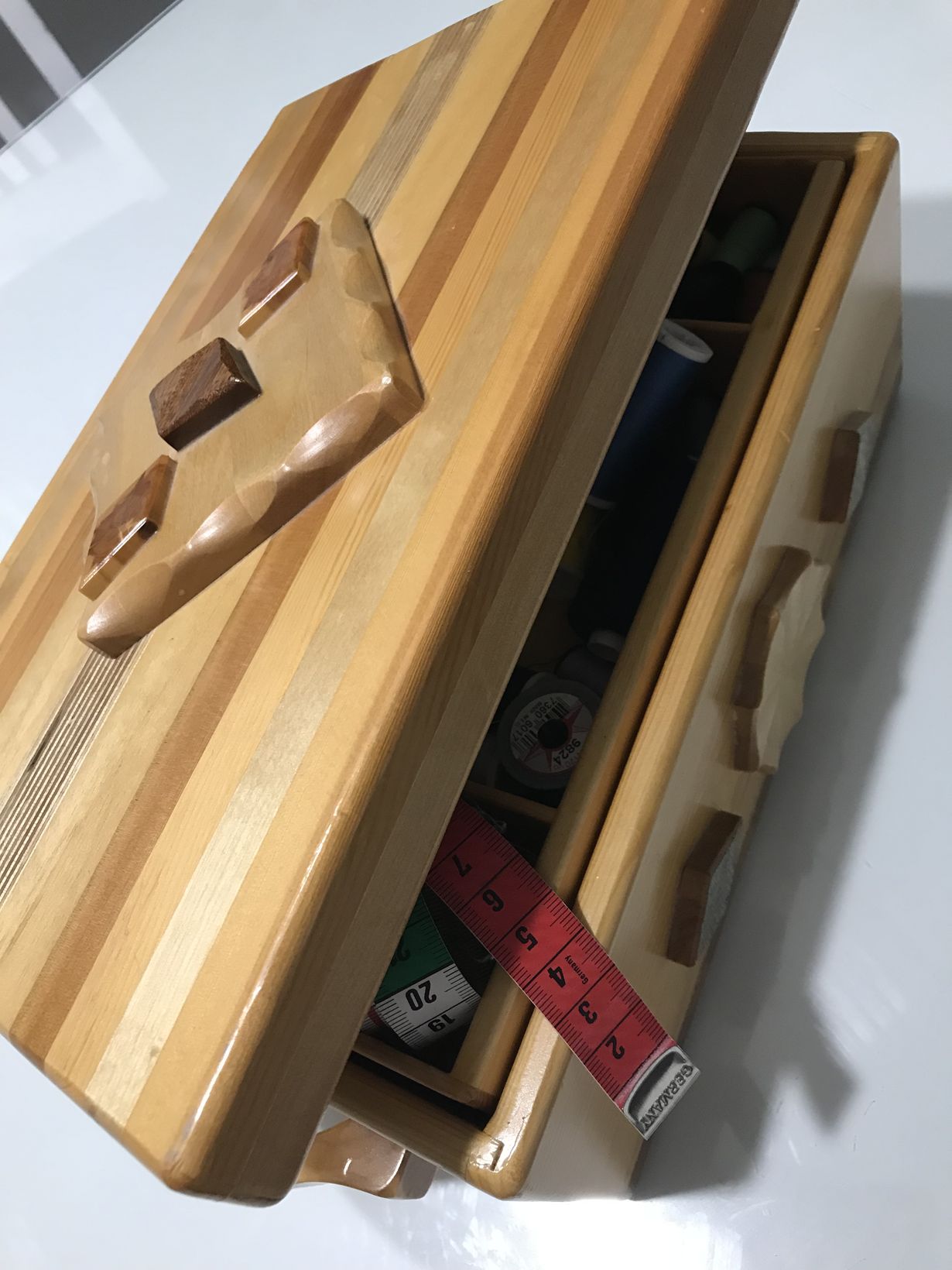 Mieheni teki minulle ompelurasian puuseppäkoulutuksensa aikana v.2001. Rasia on palvellut hyvin, välillä se on tuhannen sekaisin, langat solmussa, mutta sitten siivoan sen taas, ja taas kaikki pieni ja tärkeä löytyy.❤️❤️❤️