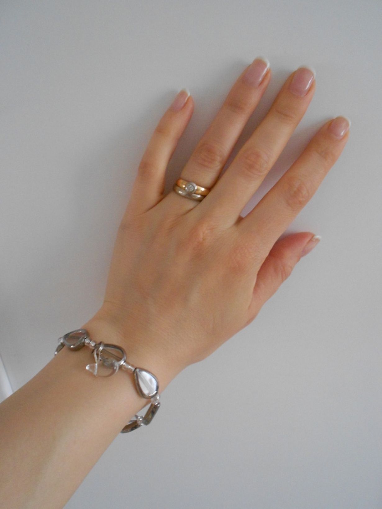 Valkokultainen kihlasormus sekä kultainen vihkisormus timantilla. Ovat Millenium-sarjaa. Menimme naimisiin vuonna 12.5.2001 eli äitienpäivän aikoihin.